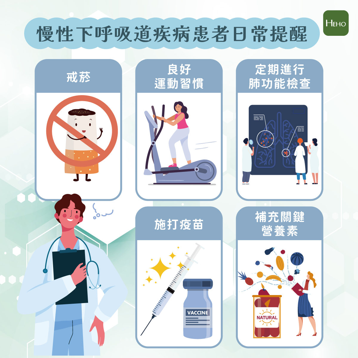 傅彬貴醫師建議 若是有慢性下呼吸道疾病的患者,除了要戒菸、保持良好運動習慣、定期進行肺功能檢查、施打疫苗、補充關鍵營養素也很重要。因為 COPD 的病人其肺功能變差,導致活動力下降,也會覺得自己無須攝取過多食物,導致關鍵營養素的攝取量明顯不足。更重要的是,透過正確用藥、搭配健康的生活方式(包含適當的營養補充、與規律運動),更能幫助慢性下呼吸道疾病患者,活出更健康的人生。